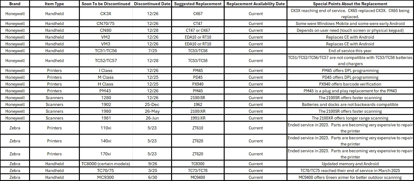 To make things a little easier, I’ve included a chart below listing some of the Zebra and Honeywell devices that are being discontinued, along with their recommended replacements, and other important information you will find beneficial to know. This chart will give you a better idea of what’s affected and help you decide if it’s time to make the move to something new.